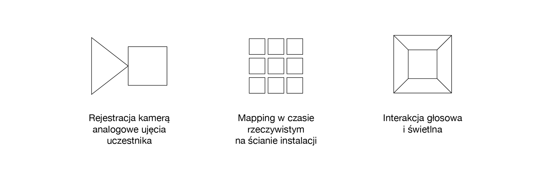 The installation captures participants’ image using a camera exclusively for artistic purposes — the footage is processed in real time and displayed as part of a visual projection.